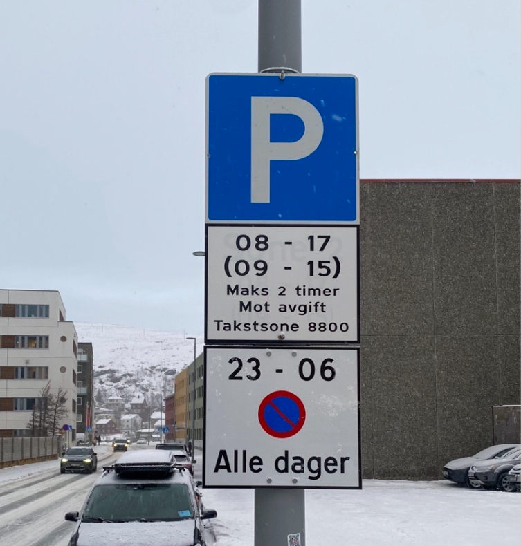 På grunn av skilt med parkering forbudt i Mellomgata fra søndag kl. 21 til mandag kl. 08, har Hammerfest Parkering KF tidligere henvist beboere med beboerparkering i Mellomgata til Strandgata.